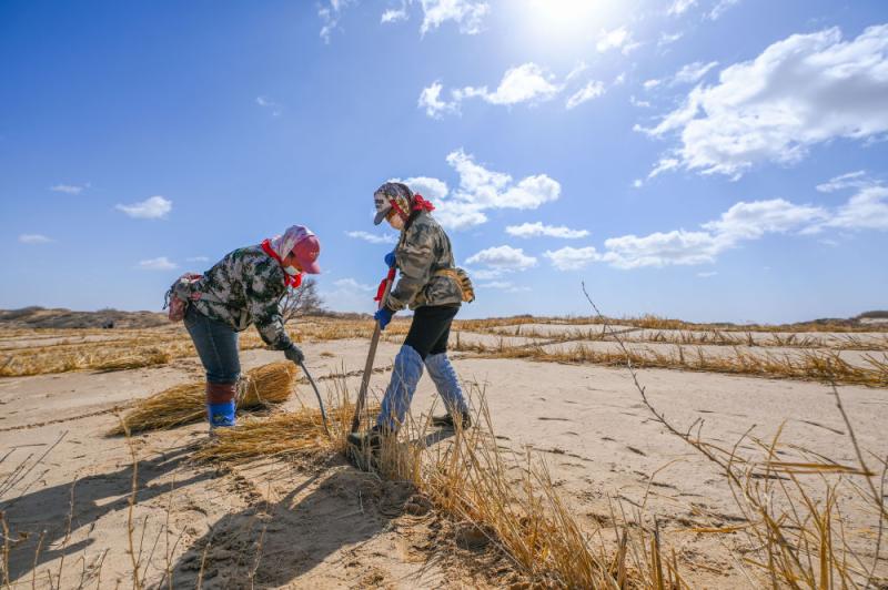2024年3月28日,在内蒙古通辽市科尔沁左翼后旗阿古拉镇,治沙工东谈主在科尔沁沙地里打草方格。新华社记者 连振 摄