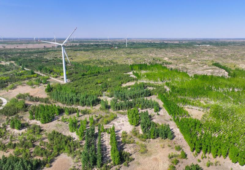 这是在内蒙古通辽市科尔沁沙地“双百万亩”轮廓管束工程努古斯台步地区拍摄的风力发电机组(2024年5月15日摄,无东谈主机相片)。新华社记者 连振 摄