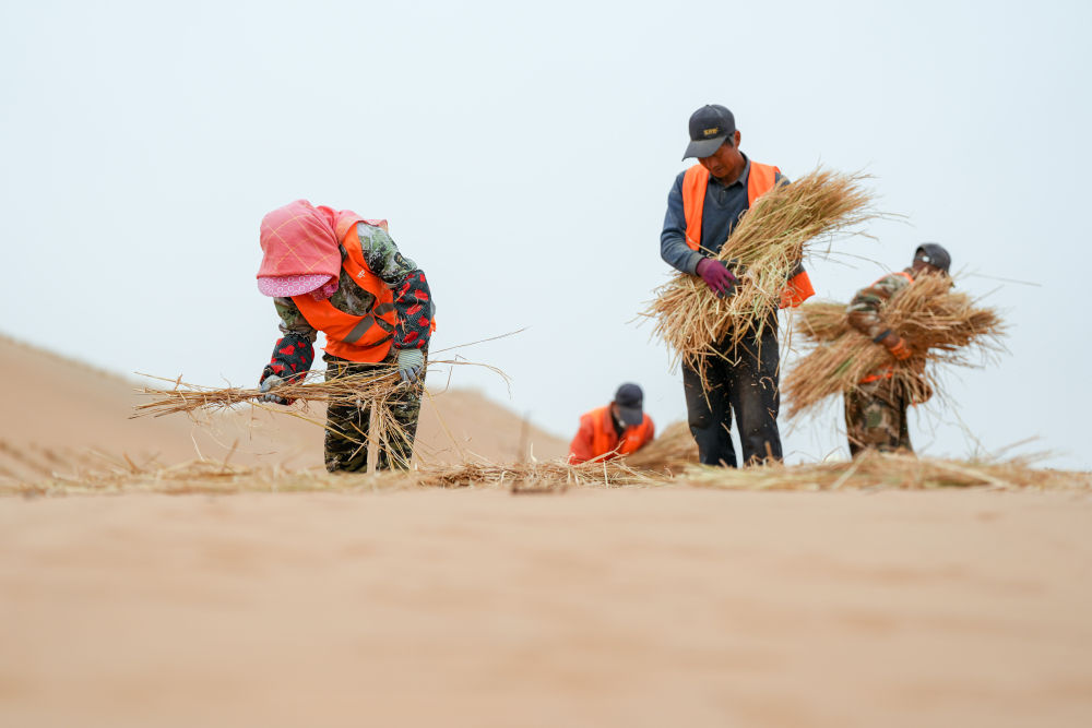 2024年4月27日,在内蒙古阿拉善左旗腾格里沙漠S315沿线固沙工程现场,治沙工东谈主用稻草在沙漠中扎草方格。新华社记者 连振 摄