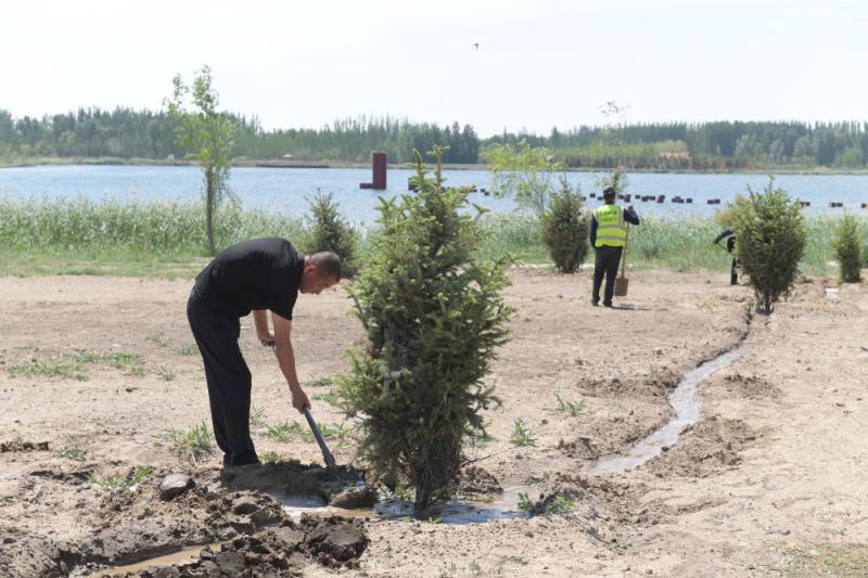 2024年4月23日,在地处黄河“几字弯”的内蒙古巴彦淖尔市临河区,新华林场员工给新栽种的树木浇水。新华社记者 李云平 摄