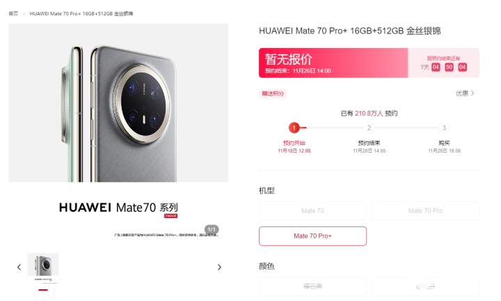 华为Mate 70系列将在11月26日推出,华为方面在11月18日12:08开启预约,一天不到的时辰,Mate 70系列就仍是拿下了210.8万东说念主次的预约,融会至极火爆。